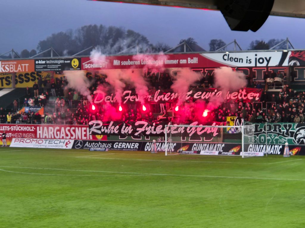 Diesmal entschied ich mich für einen Sitzplatz. Dabei war der Einlass schon mal Abenteuerlich, die Scanner funktionierten nicht und ein etwas demotivierter Mitarbeiter machte einfach allen Leuten das Drehkreuz auf, ohne irgendwas zu kontrollieren. Auch Sicherheitskontrollen gabs keine. Auch Polizei war diesmal keine zu sehen, war aber auch alles nicht nötig. Kapfenberg kam genau mit 0 ( N U LL ) Leuten an. Da war wirklich niemand im Auswärtsblock, wäre in Deutschland in einer so hohen Liga wirklich unbedenkbar. An dem Spieltag war in Ried Tag der Nachwuchsmannschaften. Hierbei haben Kinder und Jugendliche rund 1000 Freitickets für das Spiel bekommen, tolle Aktion – war aber auch teilweise etwas anstrengend. Zur Halbzeitpause gab es dann ein kleines Spielfeld wo Jugendmannschaften gegeneinander spielten. Leider wird im normalen Ligabetrieb der Stadionbesuch in Ried wohl nicht sehr zelebriert, zieht man von den 3550 Leuten die 1000 Freikarten ab sähe es sehr mau im Innviertelstadion aus. Der Ultra Block der Rieder lieferte aber wieder einen guten Auftritt ab. Hierbei kam es auch zu einer Gedenkchoreo für den gestorbenen Rieder Fan Gery. Weitere Infos dazu gabs leider nicht, falls ihr mehr Infos dazu habt gerne kommentieren. Oder wie die 2 älteren Herren neben mir diskutierten: