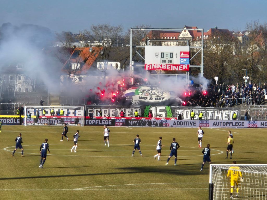 Stimmungsmäßig hat man neben dem ganzen homofeindlichen Beleidigungen, Ableismus, Patriotismus und Rassismus weniger Zeit für einen organisierten Support. Wirklich laut wurde die Szene von Ulm nie – ich hab dafür die ganze Zeit Paderborn gehört – im Ulmer Heimbereich. Paderborn hatte einen sehr starken Fanaufritt, hier wurde mal wieder in dieser Saison der nach oben völlig offene Auswärtsblock genutzt und neben Bengalos auch Feuerwerk gezündet. Außerdem gabs eine Choreo zu einer 15 Jährigen Freundschaft mit Ultras eines Schweizers Eishockeyclubs (wilde Kombination).
