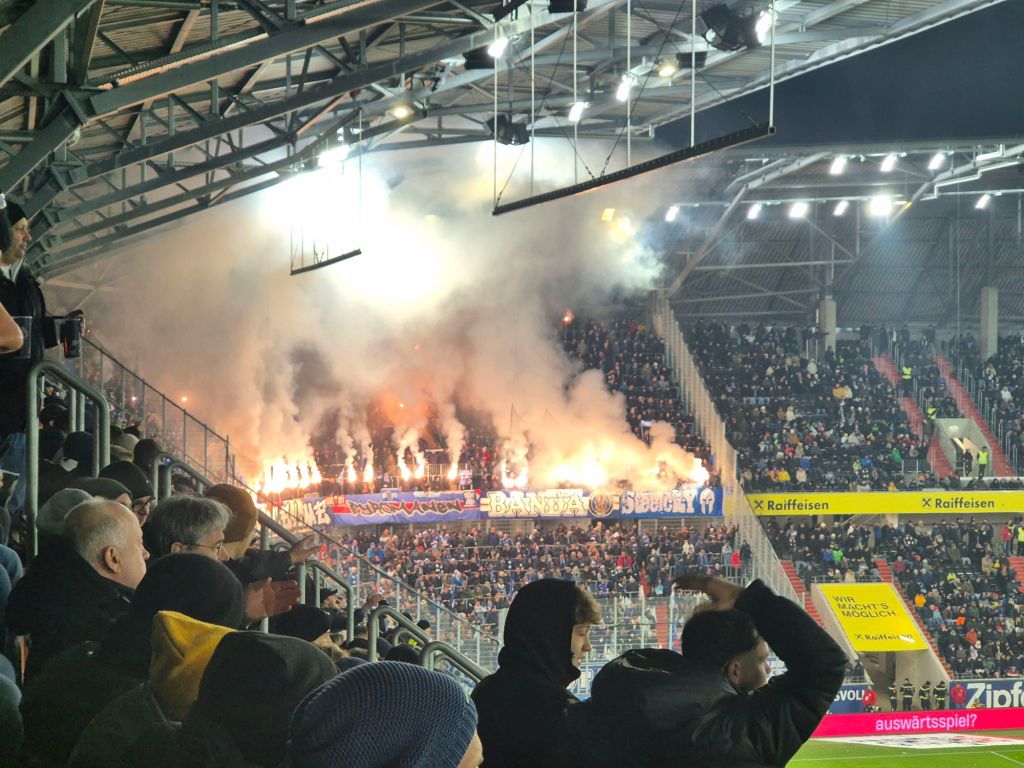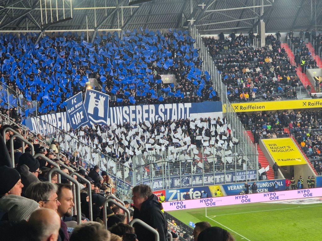 Dieses verrückte Wochenende sollte nach dem Freitagsspiel in München, Samstags in Ulm noch ein besonderes Highligt haben. Sonntag ab in die Oberösterreichische Landeshauptstadt zum Linzer Derby. Die Bahn war zwar chaotisch wie eh und je, aber ich schaffte es noch zum Fanmarsch von Blau-Weiß Linz. Bisschen überraschend: dies war erst das vierte Linzer Stadtderby (in dieser Konstellation) in diesem Jahrhundert. Blau-Weiß spielte sonst immer unterklassiger, so sind noch richtig viel Emotionen im Spiel. Rund 1200 Menschen beteiligten sich an dem Fanmarsch, es wurde richtig viel Pyrotechnik gezündet (fand super das auf Böller verzichtet wurde, dies hielt soweit ich das mitbekam auch den ganzen Tag an). Es ware jede menge (Riot) Polizei in den umliegenden Straßen verteilt, am Marsch selber war allerdings kaum Polizei dran. Insgesamt aggierte die Polizei sehr zurückhaltend an dem Tag. Es kam auch zu keinen Fanprovokationen und verlief alles ruhig (aber akkustisch laut und farbenfroh) ab. Nur geparkte Autos wurden massenhaft gestickert, hätte man lassen können – aber nunja es gibt dann doch schlimmeres. Auf den letzten Meter auf dem Gugl (da steht das Stadion) wurden dann noch 2 Feuerwerksbatterien gezündet. Witzigerweise trugen mehrere vermummte an der Front Weihnachtsbäume. Was mit denen passiert ist blieb mir aber verborben, weil ich bog vorher ab und wechselte in den LASK Bereich.