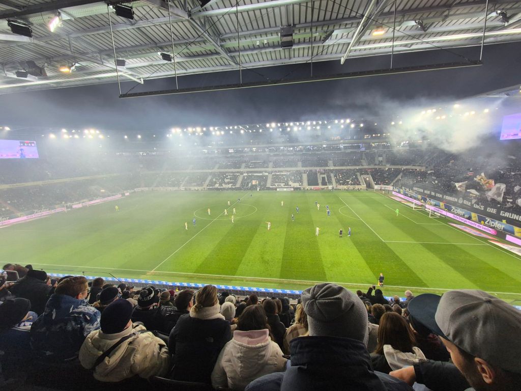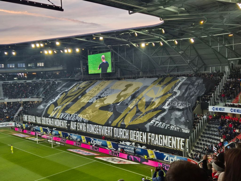 Der Andrang war für LASK Verhältnisse unglaublich, das Stadion ist äußerst selten mal ausverkauft – was man leider auch am Service merkte. Essen und Getränkebestellungen dauerten einfach ewig. Ich hab mich in der Zwischenzeit noch mit einem LASK Fan (Gruß und Herzliches Beileid für die Schlagzeilen, die der Verein in den letzten Monaten so geschrieben hat) getroffen und so ging die Zeit auch schnell rum. Es gab eine mehrteilige Choreo im Lasker Stehblock zum Derby und zu 10 Jahre Landstrassler. Angefangen hat das ganze mit dem Spruchband „Eine Dekade voller goldener Momente – auf ewig konserviert durch deren Fragmente“. In der Minute wurde ein Landstrassler Ultra mit Fischerhut und Polaroid Kamera hochgespannt, die Kamera blitzte und löste „Sofortfotos“ aus. Mega gelungen! Danach wurde eine riesige Zaunfahne über den Block gespannt, mit mehreren Bildern rund um die Geschichte der 10 Jahre Landstrassler. Danach folge der dritte Teil: nun wurde das Spruchband durch „10 Jahre Landstrassler“ ausgetauscht und auf den Rängen gab es schwarze und gelbe Pappen – welche eine 12 (Landstrassler Logo) bildeten. Nach der Halbzeitpause gab es noch ein „Dressen nur in den Farben, die uns die Gründervater gaben“ – eine Anspielung gegen den Investor BTW und den Plan ein Pinkes Trikot einzuführen. Blau-Weiß hatte zum Anfang eine kleine Choreo mit dem Motto „Die Farben unserer Stadt (Suprise Blau und Weiß). Supportmäßig waren die Fans vom LASK dauerhaft laut und super dabei, Blau-Weiß hatte da doch die ein oder andere Schwächephase drin. Dafür hatte Blau-Weiß ungefähr zur 70. Minute eine super stabile Pyroshow am Start, LASK setzte „nur“ auf einzelne Bengalos, die wurden dafür dauerhaft eingesetzt.