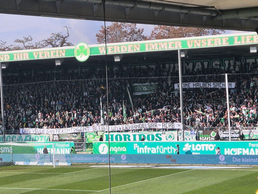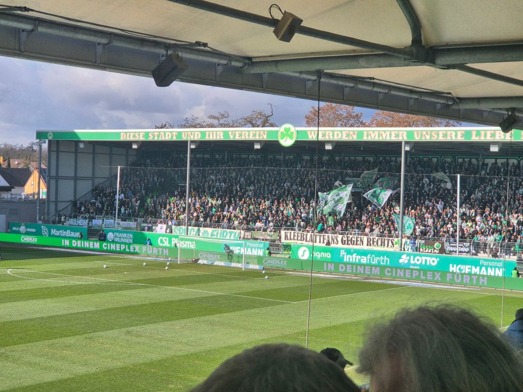 Fürth grenzt direkt an Nürnberg und hat rund 130.000 Einwohner*Innen. Dies ist immerhin die sechstgrößte Stadt in Bayern. An einem lauen warmen Februarsonntag entschloss ich mich deswegen durch ein Spaziergang durch die wirklich schöne Altstadt zum Stadion, vom Bahnhof aus. Witzigerweise geht der direkte Weg durch einen Friedhof, und der Weg wurde auch von vielen Fans genutzt. Das Stadion findet man dann direkt in einem Wohngebiet, hat einen sehr Englischen Style.