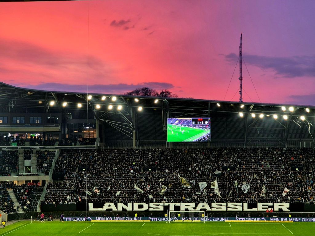 Ich hatte mir einen Zug zurück ausgesucht, wo ich ohne jeden Stress zurück zum Bahnhof hätte laufen können und wäre zeitlich abends frühzeitig zuhause gewesen. Natürlich musste dann nach der LASK Führung in einem spielerisch schwachen Spiel, Wolfsberg den Ausgleich kurz vor der 90. Minute machen. Danach folgte eine wirklich gute Verlängerung, in der beide Mannschaften versuchten die Entscheidung zu erzwingen – es aber nicht schafften. Danach folgte noch das entscheidende Elfmeterschießen, und LASK verlor passend zur Saison – und ich musste den Nachtzug nehmen. Dafür konnte ich einen wunderschonen Sonnenuntergang im Stadion erleben.