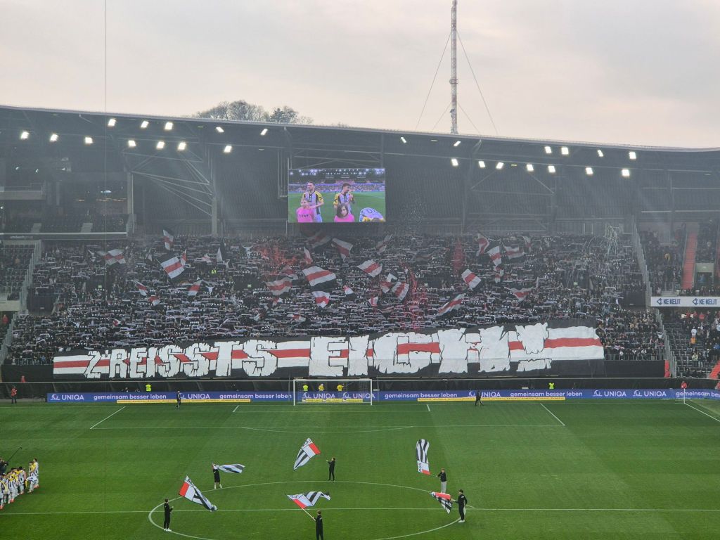 Ich hatte ja wegen der verkorksten LASK Saison größere Hoffnung auf einen guten Kurvenauftritt, immerhin wäre der ÖFB Cup noch ein Weg gewesen nächstes Jahr international zu spielen – aber wirklich wie in einem Pokal Halbfinale kam man ich mir nicht vor. Das Stadion nicht ansatzweise ausverkauft und auch die Landstrassler hab ich schon deutlich besser erlebt. Die sonst so kreativen Choreo war diesmal auch sehr einfach gehalten. Dazu wurde immer mal wieder eine Fackel gezündet. Wolfsberg, die keine große Szene haben, waren mit rund 200 Leuten da – hatten aber überraschenderweise sogar bisschen Liedgut dabei.