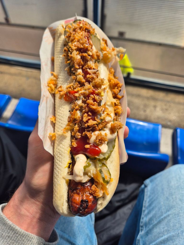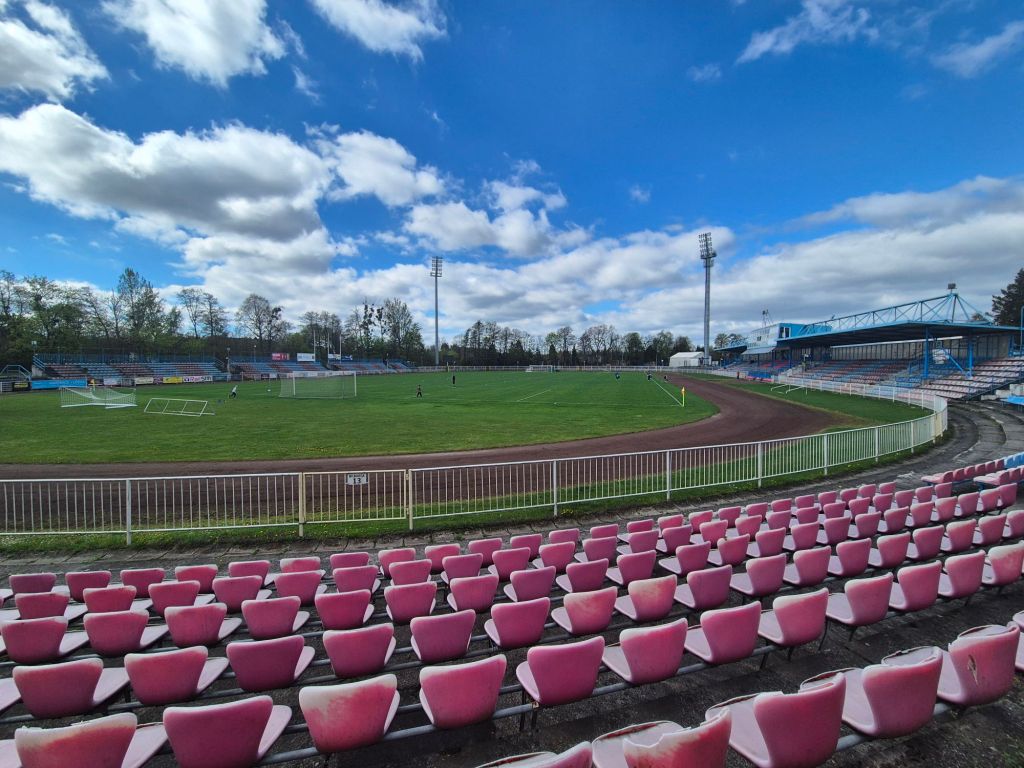 Wodzisław Śląski hat rund 50.000 Einwohner*Innen und liegt direkt nach der Tschechischen Grenze in der Woiwodschaft Schlesien. Erwähnenswert ist das wirklich schöne Zentrum der Stadt. Der Fußballverein Odra Wodzisław Śląski wurde im Jahr 1922 gegründet und spielte in seiner Historie 14 Jahre lang in der höchsten Liga von Polen, der Ekstraklasa. Nach Insolvenzen stellte man 2013/14 den Spielbetrieb ein und begann in der Saison 2015/16 neu in der 9. Liga. Mittlerweile hat man sich wieder in die 3. Liga hoch gekämpft (3. Liga in Polen ist quasi die 4. Liga – weil man die Ekstraklasa nicht mitzählt). Schon in der Online Recherche entdeckten wir ein VIP Ticket für ca. 7 € – egal was das kann, wir mussten es haben. Vor Ort am Kassenhaus fragten wir die Verkäuferin was das Ticket den nun beinhaltet und bekamen eine sehr witzige Antwort „Keine Ahnung, ich war da schon ewig nicht mehr drin.“ Also ließen wir uns überraschen. 30 Minuten vor Anstoß wurde die Zapfanlage noch aufgebaut, der Grill angeheizt – Stress herrschte hier definitiv nicht. Dazu gabs einen Szeneverkauf von Polnischen Szenemenschen, die genauso Aussahen wie man sie sich vorstellt. Waren übrigens sehr nett, wenn man sie auf polnisch angesprochen hat. Allerdings sollte man schon jemanden dabei haben, der diese Skills beherrscht. Mittlerweile hatten wir dann auch das Rätsel um das VIP Ticket gelöst. Es gab einen Sitz auf der Haupttribüne und einen Zugang zu stationären WC’s – der Rest hatte Dixi Klo’s. Das Waschbecken ging aber übrigens nicht. Kurz vor Anstoß schaffte man es dann auch mal die Zapfanlage zum laufen zu bringen – und das lokale Bier war für ein Stadionbier absolut genial. Kulinarisch gabs eine sehr leckere polnische Hotdog Version.