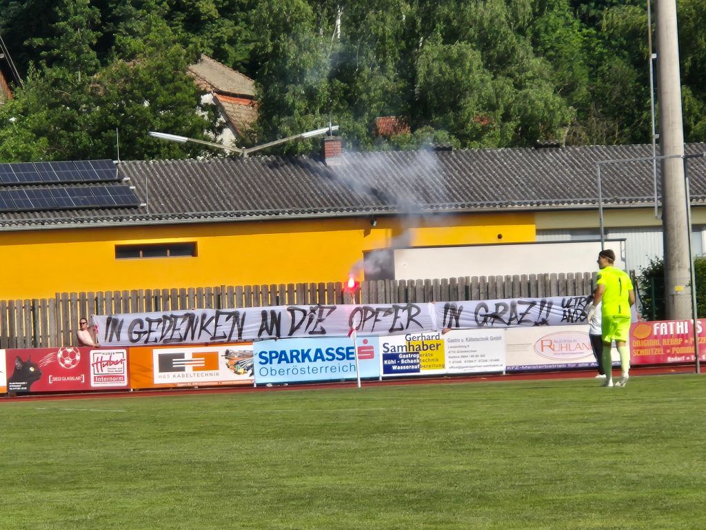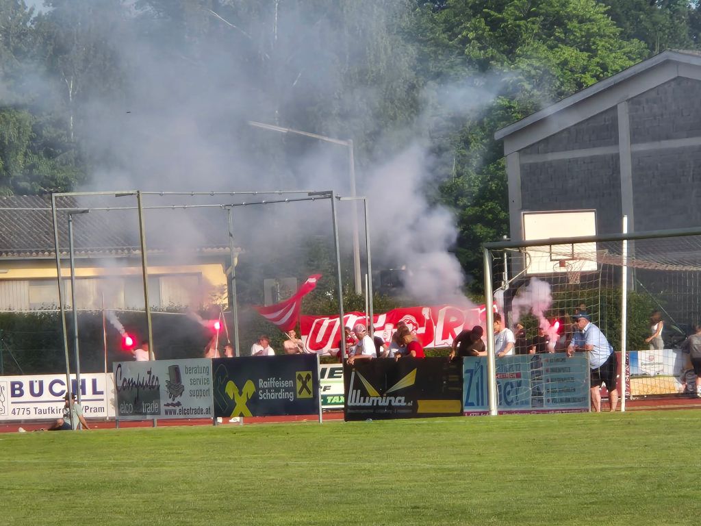 Muss man Andorf kennen? Absolut.. nicht! Die Gemeinde Andorf liegt in Oberösterreich im Bezirk Schärding und hat rund 5200 Einwohner, die Sehenswürdigkeiten des Orts sind 2 Kirchen. Am letzten Spieltag der Saison 2024/25 konnte der FC Illumina Andorf noch aufsteigen, also nichts wie hin. Leider war die Tribüne wegen Bauarbeiten gesperrt, also ab auf eine Bierbank. Sicht war deswegen maximal bescheiden. Andorf hatte den Aufstieg nicht selbst in der Hand und war auf Schützenhilfe anderer Vereine angewiesen, was nicht klappen sollte. Am Kassenhäuschen gabs das Spieltagsheft und einen Schock – als Matchballsponsor wurde die FPÖ Oberösterreich ausgewählt, ein Landesverband der nochmal einen deutlich radikaleren Rechtskurs als andere FPÖ Landesverbände fährt. Auf eine Anfrage wurde diese Entscheidung verteidigt, der FC Andorf müsse in jeden „harten Zeiten, Geld von allen Organisationen annehmen“ – solange sie demokratisch sind natürlich. Nunja. Auf der Liste hatte ich den Verein aus Hoppersicht tatsächlich schon länger, es gibt dort nämlich eine aktive Fanszene. Die zündete zum Start massiv Pyro und entrollte ein Transparent. Allerdings konnte man die Stimmung absolut nicht halten und hatte jede Menge lange Pausen drin. Auch der gewählte Standort ist für mich merkwürdig, da würde es deutlich bessere Ecken geben. Man steht nämlich weit außerhalb, quasi auf dem Baskettballplatz. Der Rentner neben mir regte sich (natürlich) über die Pyro auf und mutmaßte, wie man nur so viel Pyro mit auf den Sportplatz bekommen kann. Wichtige Frage bei einem Platz, bei dem es keinerlei Sicherheitskontrollen gab. Leider wurde ich dann ungefragt auch noch in die Gesprächsrunde der Rentner integriert. Die Ultas Andorf zündeten dann noch einen Gedenkbengalo und ein Spruchband für die Opfer des Amoklaufs in Graz – hier hätte man sich auch ein Tshirt anziehen können, wenn nicht gar müssen. Spielerisch fertigte der FC Andorf den chancenlosen SC Schwanenstadt an einem sehr heißen Sommertag ab. Ground erledigt, von der Fanszene enttäuscht, von dem rechtsoffenen Verein enttäuscht – man wird mich hier also nie wieder sehen.