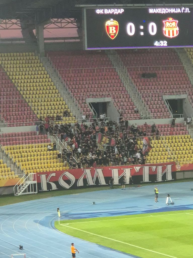Wenn man noch Urlaubstage unverplant über hat, und einen weiteren Länderpunkt machen möchte – fliegt man wohin? Genau! Nach Nordmazedonien. Protestmäßig wird das übrigens weiterhin von fast allen dort Mazedonien genannt – aber wir wollen ja korrekt bleiben. Skopje ist die Hauptstadt mit rund 526.000 Einwohner*Innen. Nachdem wir versuchten im Vorfeld Tickets für das Spiel zu bekommen, was übrigens unmöglich ist gingen wir halbwegs nervös zum Stadion. Wird es eine Tageskasse geben? Setzt dieses Land auf irgenwelche Geoblocking Ideen? Nein, vor Ort bekamen wir direkt mit: Fußball hat in Nordmazedonien kaum einen Stellenwert. Einen Vorabkauf gibt es quasi nie, man geht zur Tageskasse und gibt stolze (umgerechnete) 3,20 € aus und hat eine freie Platzwahl in einem fast leeren Stadion. Mit dem kleinen Stimmungsblock dürfen es höchstens 1000 Zusehende gewesen sein. Das Stadion hat auch eine verrückte Geschichte. Der Baubeginn war 1977, danach folgte im vom Korruption geprägten Land typische Geschichten. Gelder wurden hin und hergeschoben, Arbeiter nicht mehr gezahlt und Firmen gingen pleite. 2012! wurde die Arena dann vollendet. In einem Fußballmatch war die Arena übrigens bis heute nicht ausverkauft. Direkt nach dem sehr lockeren Sicherheitscheck suchten wir einen Kiosk im Stadion – gibt es nicht. Man darf nur Wasser ins Stadion mitnehmen, dies wird draußen von Händlern erworben. Hier gibts auch Snacks (die man aber nur draußen essen darf). Im Stimmungsblock tritt „Komiti“ organsiert auf, eine rechtsoffene Ultravereinigung die den Fußball politisch nutzt. Bis heute wird die Einigung mit Griechenland abgelehnt. Auch Kontakte zu russischen Investoren werden ihnen nachgesagt. Wir waren froh das es immerhin einen kleinen Stimmungsblock gab, sonst wäre das ganze sehr trostlos gewesen. Immerhin ist die Stadionarchitektur genial, trifft genau meinen Geschmack. Fußballerisch war das ganze gefühlt nichtmal auf Regionalliga Niveau – es war wirklich schlimm. Immerhin konnte Skopje irgendwie einmal das Tor treffen. Witzigerweise wurde die Kulisse kurz von mehreren Schulklassen aufgefüllt – die in der 20. Minute kamen und in der Halbzeitpause alle wieder gingen. Zum Verpflegung holen ist es übrigens erlaubt das Stadion zu verlassen und wieder zu betreten. Erfolgte quasi die ganze Zeit. Danach suchten wir erstmal die nächste Bar auf.