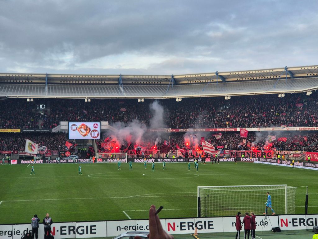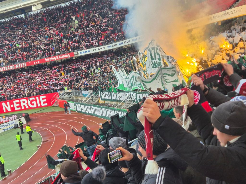 In Nürnberg stand (mal wieder) das älteste und am häufigst ausgetragene Lokalderby in Deutschland an. Genau genommen war es das 275. Frankenderby. Durch einen recht spontanen Ticketkauf landeten wir auf der Südkurve, die in Nürnberg ja doch nur relativ selten offen ist. Der Heimbereich war komplett ausverkauft, die Gäste aus Fürth ließen relativ viel Gästekontingent ungenutzt (warum?). Leider hatten wir übermotiviert und betrunkene Kiddies (würde da auch andere Substanzen nicht ausschließen) neben uns, die einfach nur völlig Niveaulos in den Gästeblock pöbelten. Zum Gästeblock gibt es von der Südkurve dabei auch keine große Absperrung. Ungewohnt in Deutschland, und vielen Dank an die Leute – die unbedingt eine Eskalation an dem Tag wollten. Immerhin gingen nur wenige Fürther wirklich drauf ein. Leider hat die Südkurve auch relativ wenig Catering Auswahl, dass ist in anderen Bereichen in Nürnberg wirklich besser. Die 2 Choreos am Anfang waren beide gut gelungen. Spielerisch waren beide Mannschaften schwach, bis in kurzer Zeit plötzlich viele Tore fielen. Aber insgesamt war ein Unentschieden auch Leistungsgerecht. Und wir wissen ja: Derby immer gleich X! Am Stadion blieb es danach auch Stressfrei – was auch an den Cops lag – die sich sehr zurückhielten. Geht doch!